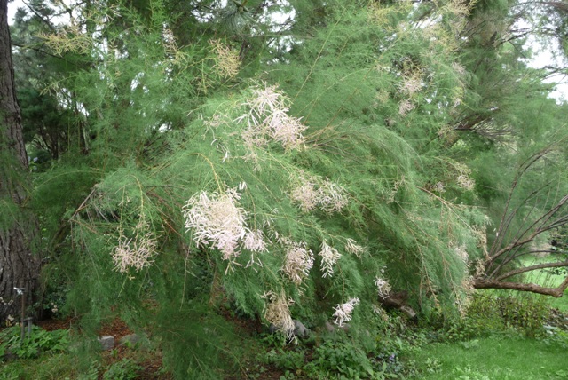 Tamariske Die Tamarisken sind eine Gattung kleiner Bäume und Sträucher von 1 bis 15 Metern Höhe innerhalb der Tamariskengewächse, die etwa 80 Arten umfasst. Die Tamarisken sind im Mittelmeerraum und in Asien bis Nordchina sowie in Südafrika in Trockengebieten verbreitet. Die Tamarisken gehören nicht zu den Nadelbaumgewächsen. Ich habe sie hier trotzdem mit aufgeführt, weil sie einem Laubbaum überhaupt nicht ähneln. Die wechselständig die Zweige dicht bedeckenden, ungestielten Blätter sind klein, schuppenförmig, unbehaart bis filzig behaart, oft grau-grün und 0,5 bis 7 Millimeter lang. Die Blätter sind in der Lage, mit punktförmigen Drüsen Salz auszuscheiden. Tamaeix gallica, Französische Tamariske ![]() ![]() ![]() Tamarix ramosissima, Kaspische Tamariske ![]() ![]() ![]() Tamarix ramosissima `Rosaea´, Kaspische Tamariske ![]() ![]() |